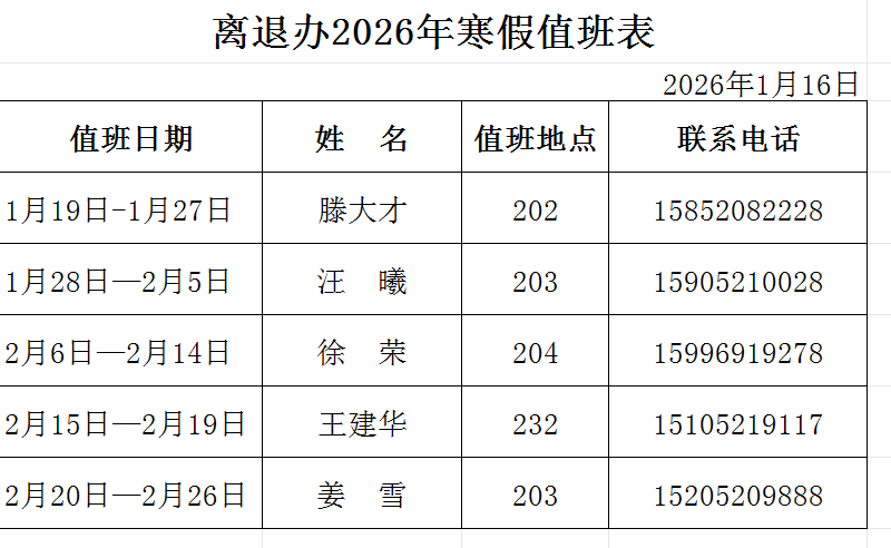 各位老同志:学校将于1月19日(周一)起放假,2月27日(周五)正式上班。寒假值班表如下。