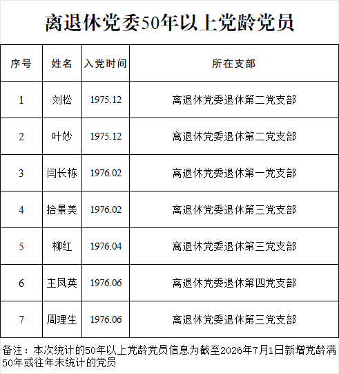 截止到2026年7月1日,徐州医科大学50年党龄老党员信息(去年已领取纪念章的老党员不再统计)公示如下: